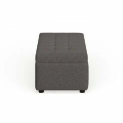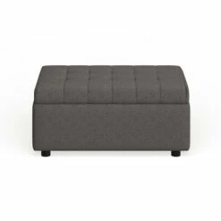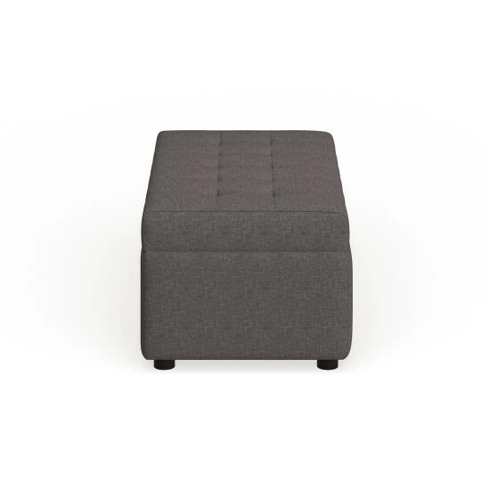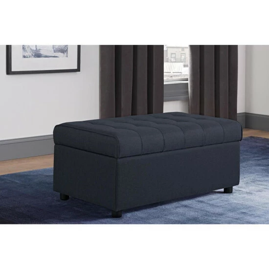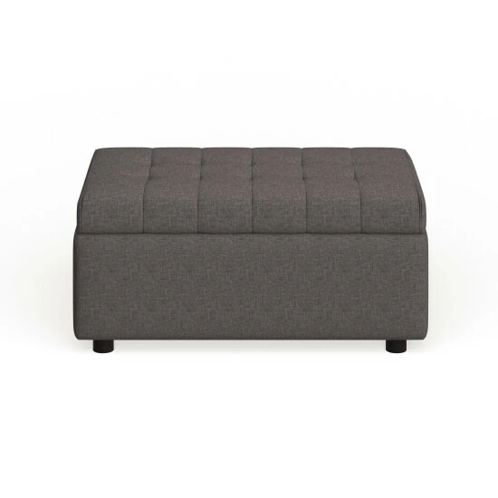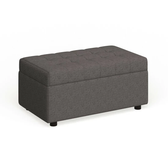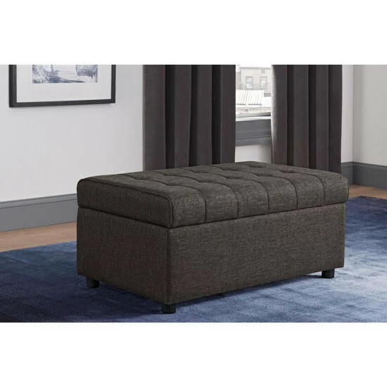 Place this versatile ottoman near the end of your bed or couch for stylish storage. Dark linen fabric upholsters this piece and features detailed stitching and tufting on the top, which adds visual interest. Open the plush, padded top to reveal an inner storage compartment, perfect for extra blankets or sheets.