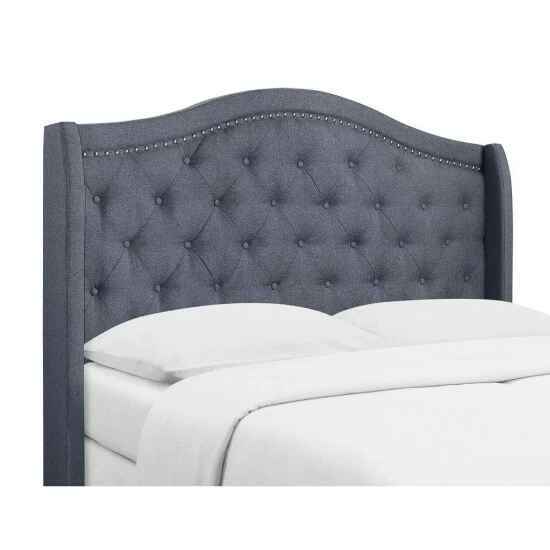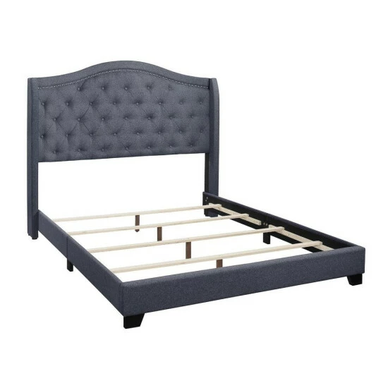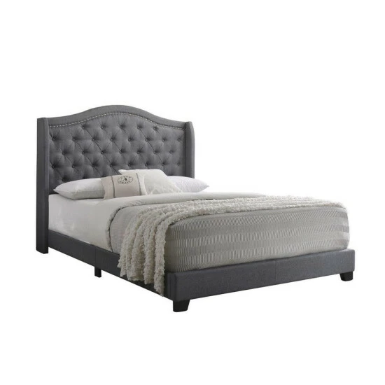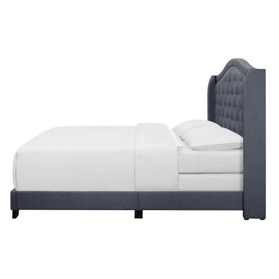 Lend comfort and luxury to your bedroom decor with this low profile bed frame. The bed is crafted from a blend of manufactured wood and solid wood, and features grey polyester upholstery along the sides rails, footboard, and headboard. The headboard has an arched silhouette and a wingback design with button-tufted detailing and a nailhead trim for an extra touch of sophistication.