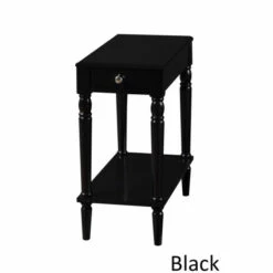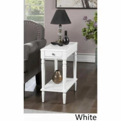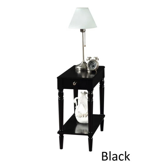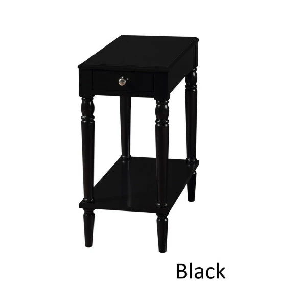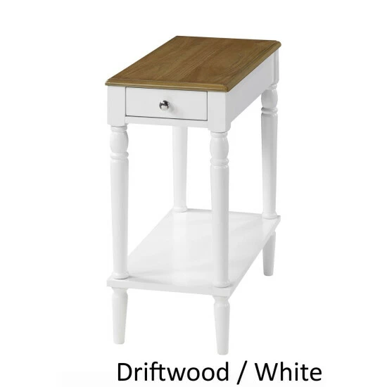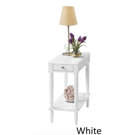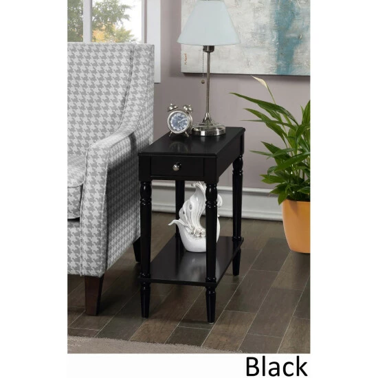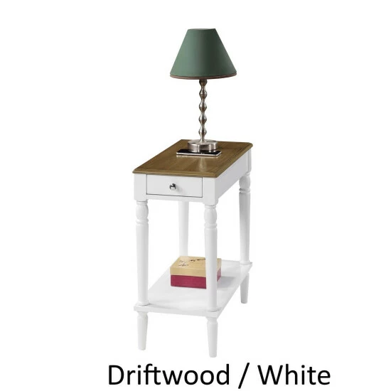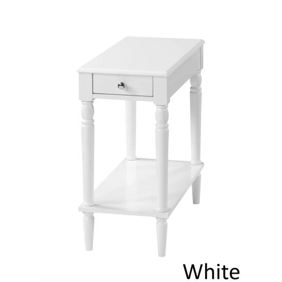 Add an attractive look to your home with this French country-style chairside table. This table is available in several different finishes and features one drawer and a spacious bottom shelf to keep your books, magazines, and electronic gadgets within easy reach. The rectangular shape makes this table the perfect piece for any small space.