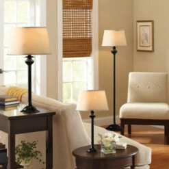Coordinate the lighting in your home with this 3-piece lamp set. Each lamp in this set showcases a classic candlestick design in a timeless black finish paired with an off-white fabric shade.