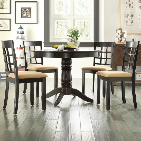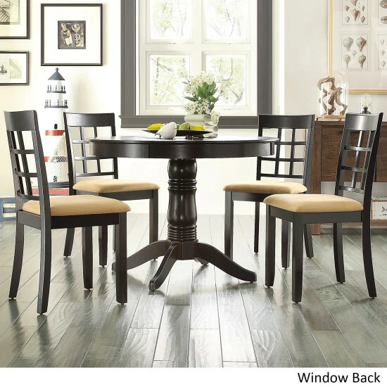 Create a cozy place to enjoy weeknight family meals with this dining set. Featuring your choice of chair backs and a dark finish, this rubberwood dining set brings a modern look to your space. The padded seat cushions provide added comfort, and the large round tabletop provides plenty of space to serve hearty platters of food to your guests.