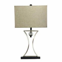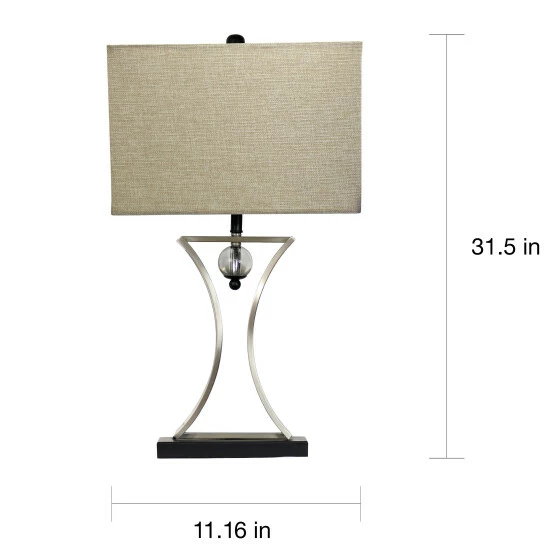 A modern and chic table lamp, featuring a geometric metal base. Constructed with metal durable metal, this lamp features a flawless chrome finish for added shine. The hourglass shape of this contemporary table lamp offers a unique visual element, while the shade perfectly accents the modern finish.
