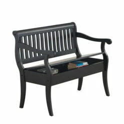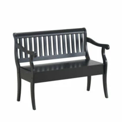 Our multifunctional, hand-crafted storage bench comes in an antique black or Elm and features a large storage area underneath the seat. It has a hand rubbed antique finish. It features a classic design with a slatted back and scrolled arms. It comfortably accommodates up to two people.
