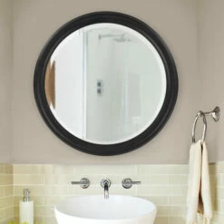 Give your bathroom depth and dimension with this stunning round wall mirror. Featuring a matte black, wood frame, this ready-to-mount mirror brightens your living space and exudes transitional charm.