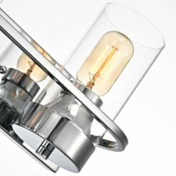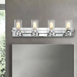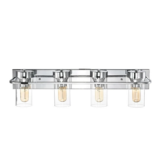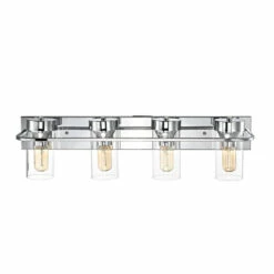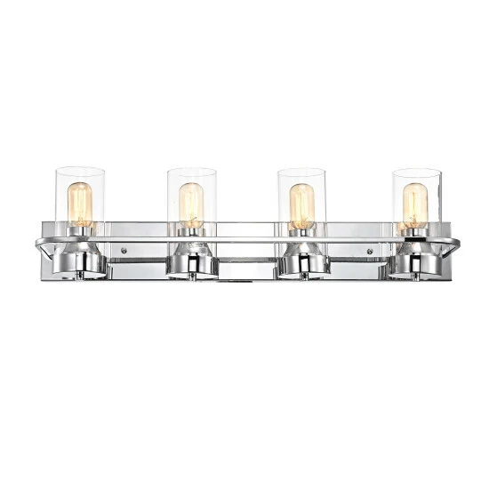 Take home a masterpiece of bathroom lighting elegance, and savor the chic vibes of this vanity fixture as you prepare for your day. This four-light bathroom vanity fixture features a chrome finish ideal for nearly any space, while clean lines on a steel frame showcase clear, cylindrical glass shades for bare illumination.