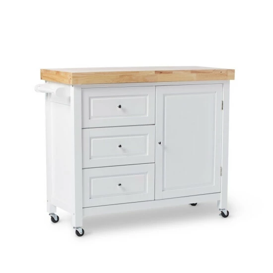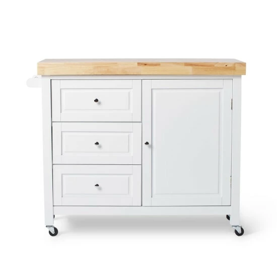 Make good use of your kitchen with the multi-functional Macaulay cart from Copper Grove. The MDF base is fitted with three storage drawers, one spacious cabinet, and caster wheels. Choose from to finishes that are each accented with a natural rubberwood tabletop.