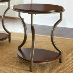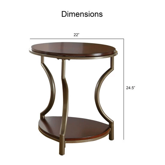 Delight in the marriage of sleek merlot cherry and pewter finished metal. This gorgeous round end table features a merlot cherry finished top and lower shelf supported by a sturdy iron frame finished in a pewter powder coat.