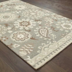 Enliven the Scandinavian style of your decor with this Marthrown area rug from Copper Grove. Rendered in grey and Beige, Cream colors, the rug is hand-tufted from wool for moderate traffic durability and lovely appeal. The large paisley and blossom pattern completes this sophisticated rug. To maintain the look and feel of your rug, blot spills immediately with a clean white cloth, vacuum regularly and spot clean using a mild soap made for the specific rug fiber. Professionally clean occasionally or when heavily soiled.