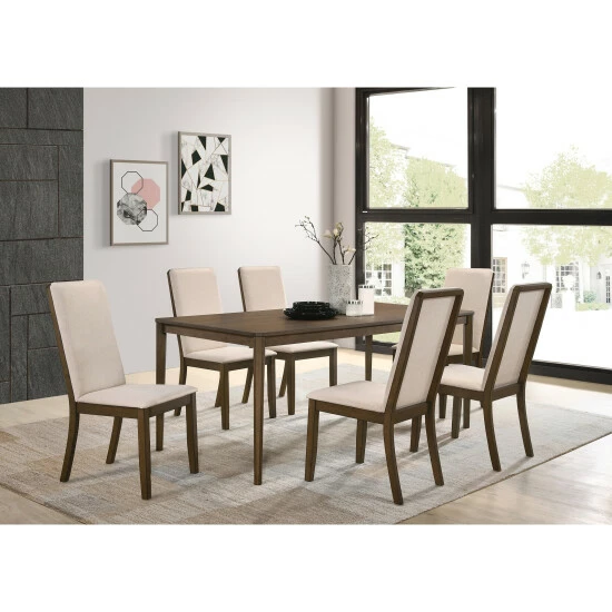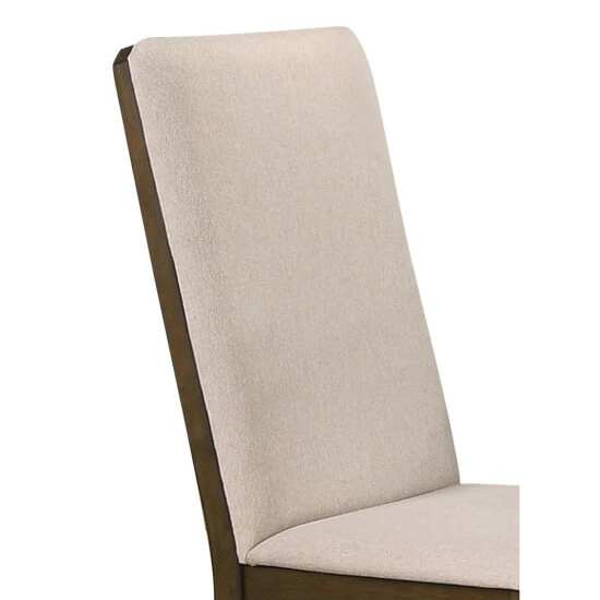 Treat your family to a comfortable dining experience. This beautiful, upholstered dining chair is crafted for comfort with a tall, supportive seat back and plush, cozy cushioning. Soft, rich, latte twill fabric gives it a light, airy look. The sturdy, wooden base boasts a warm medium walnut finish for elegant, two-tone style. Any dining space will be transformed by the impeccable design of this stylish piece.