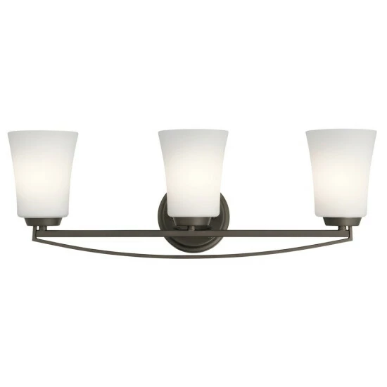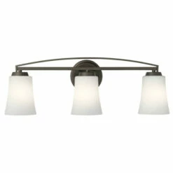 With a handsome dark bronze finish and a trio of cylindrical glass shades to boot, this piece of bathroom hardware will illuminate your space with glorious style. Its coordinating circular bronze backplate maintains its elegant aesthetic, while a wide, smooth, sleek bar upholds stylish, open-mouth shades that diffuse the mood lighting beautifully.