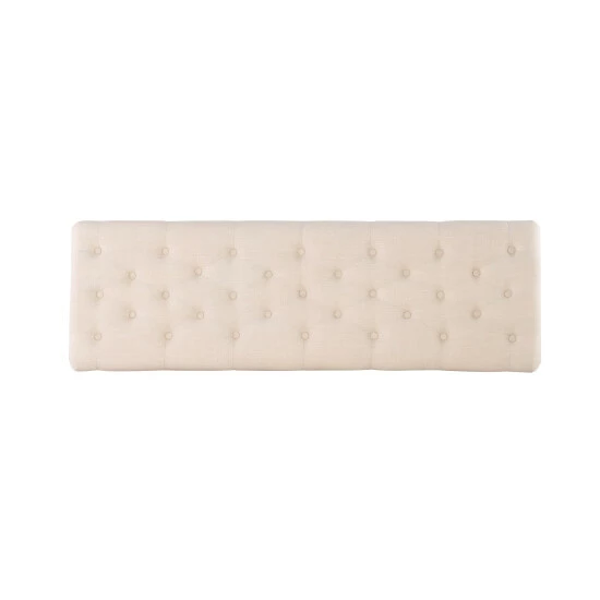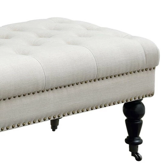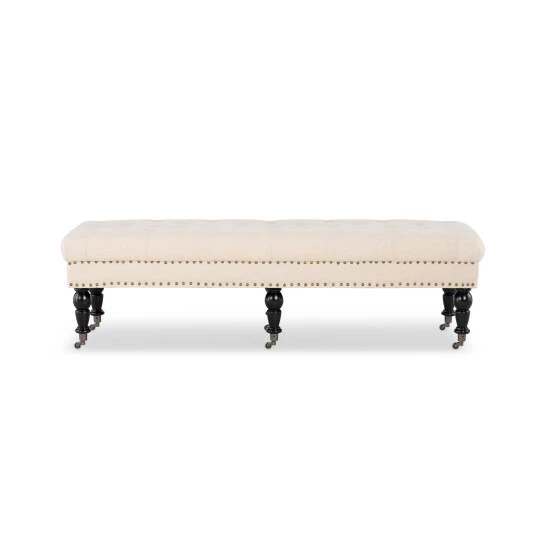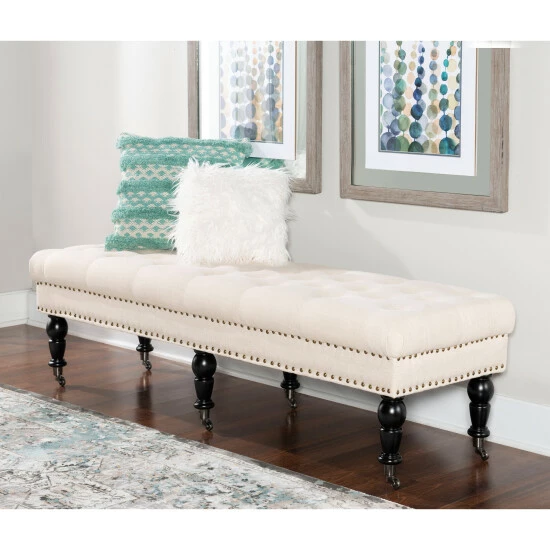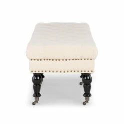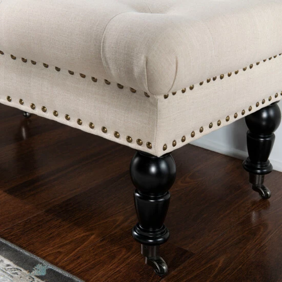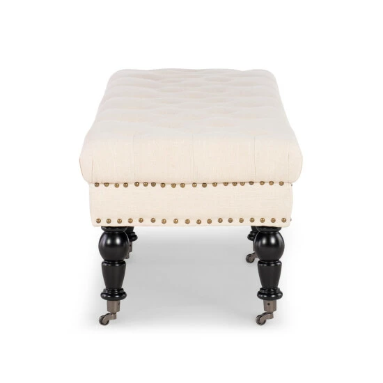 Elevate your entryway with this classic Copper Grove bench, made from espresso-finished birchwood for lasting style. The sturdy frame is padded with fire retardant foam, upholstered with off-white linen, and button-tufted for a traditional look. Metal casters add fashionable function, while burnished bronze nail head trim adds a hint of shine.