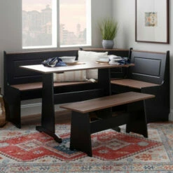 Perfect for serving meals on busy mornings, this breakfast nook has room for the whole family. The set is crafted from MDF with pinewood accents, and includes one table, one corner pieces, two corner bench pieces, and one side bench. The spacious design is available in a variety of striking finishes to enhance your decor.