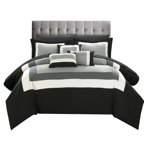 Drench your sanctuary in modern charm, via this ten-piece bed in a bag set. Its incorporates sleek shades of black, grey, and white into its color block pattern, for a fresh look that lends finish and glam to any bedroom.