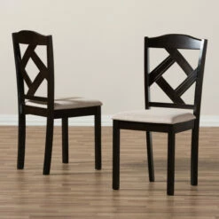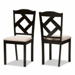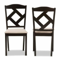 Complete the sophistication of your dining area with this set of two Monongahela dining chairs from Copper Grove. Crafted from solid rubberwood, each sturdy chair features a foam padded seat, and an open back with a diamond pinwheel design. The rich, dark brown finish contrasts beautifully with the sand brown polyester upholstery, creating a seat that is elegant, modern, and comfortable.
