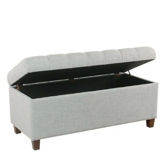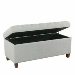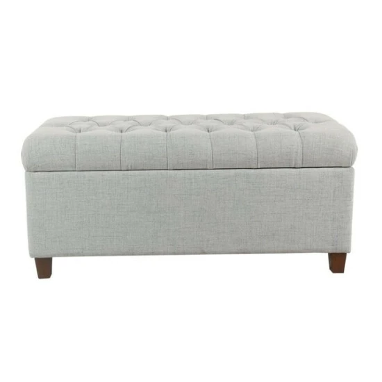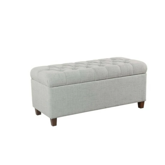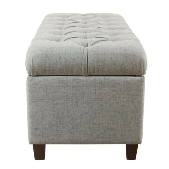 Plush yet practical, the Ainsley tufted storage bench provides a variety of home decor and storage options. Use it as a coffee table ottoman in a living room to serve guests. Put it in a family room to prop feet up after a long day. Or, place it as an end of bed bench to store pillows and blankets when not in use. With solid wood legs in a contrasting finish, soft textured fabric, and a hinged lid for easy access, the Ainsley storage bench is a premium addition for any home. Easy to assemble and maintain.