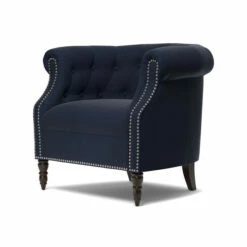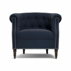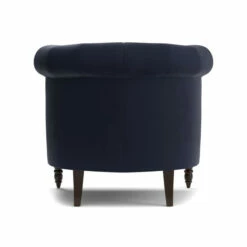 This Muir Chesterfield-style armchair from Copper Grove will add a touch of elegant style to your living room. This armchair features classic velvet upholstery and button tufting, as well as beautiful espresso-finish legs. Add a throw pillow or blanket to offset the solid navy blue upholstery color.