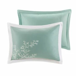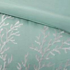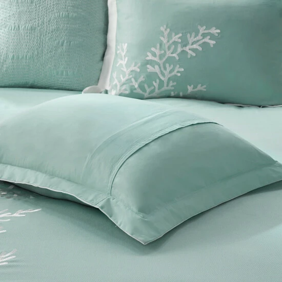 Bring a bit of sea side inspiration into your home with this beautiful bedding collection. The Harbor House Coastline collection features an intricate white coral motif embroidered on an aqua background finished with a pieced white border. Oversized and overfilled, this comforter set is made of 100% cotton with polyester filling and offers warmth and comfort to your room. Included in the set is one comforter, one border-style bed skirt, and two shams (1 for Twin size). Top off the look even more with the accessory items – Euro shams and decorative pillows which are sold separately. For best care, dry clean the comforter, shams, and bedskirt. This bedding set may come in rolled or compressed packing and will need to be fluffed up.