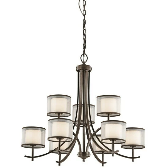 This Nebraska chandelier from Copper Grove, with its two tiers and nine lights, will instantly become a glittering centerpiece of any room it’s placed in. The Nebraska features a combination of translucent fabric covers over white glass diffusers to ensure that its lighting is even and soft.
