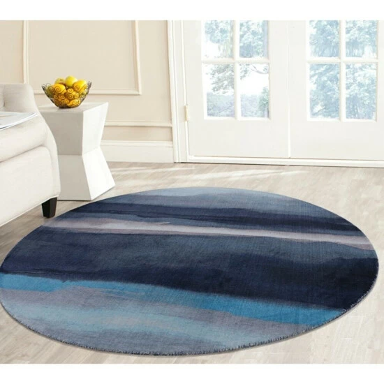 Add a modern twist to your room with this new area rug. The Blue 5’6″ x 5’6″ Canvas round rug is machine tufted with 100% nylon. Using a special printing and washing technique, this rug has the authentic look of a traditional wool rug at a far more affordable price. Due to the durable materials used in the construction process, this rug will have no shedding and is ideal for high foot traffic areas. The backside of this wonderful area rug is covered with half melanged cotton fabric for long lasting usability. With the help of our skilled artisans, the edges are hand finished, adding a beautiful handmade touch to this area rug. Whether your home decor is Modern, Contemporary, Mid-Century, or Boho, this rug will complete your home!