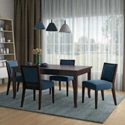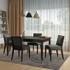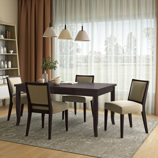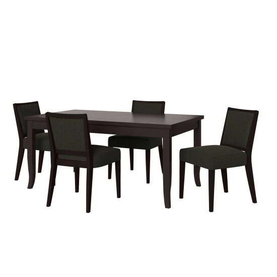 This 5-piece dining set includes 4 armless side chairs with an expandable rectangular dining table that boast an updated classic design that will elevate the look of your home. The chairs feature a solid wood frame and legs in an espresso brown finish with an upholstered seat and back cushion that provides the perfect amount of support for extraordinary comfort.