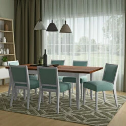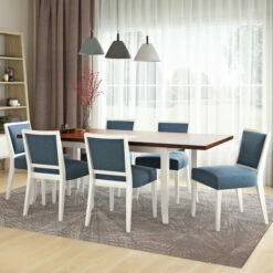 This 7-piece dining set includes 6 armless side chairs with an expandable rectangular dining table that boast an updated classic design that will elevate the look of your home. The chairs feature a solid wood frame and legs in a white finish with an upholstered seat and back cushion that provides the perfect amount of support for extraordinary comfort.