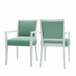 Host your parties with confidence when you acquire this set of two matching arm chairs for extra seating. The solid white frames, arms, and legs provide a sturdy base that contrasts with the upholstered seats and back cushions, which are available in a variety of colors to match any decor.