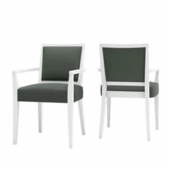 Host your parties with confidence when you acquire this set of two matching arm chairs for extra seating. The solid white frames, arms, and legs provide a sturdy base that contrasts with the upholstered seats and back cushions, which are available in a variety of colors to match any decor.