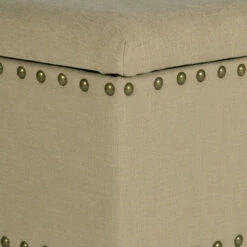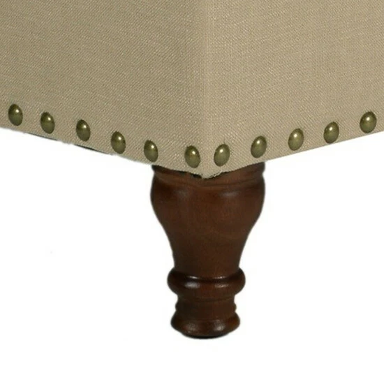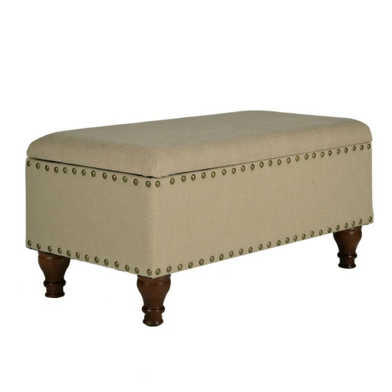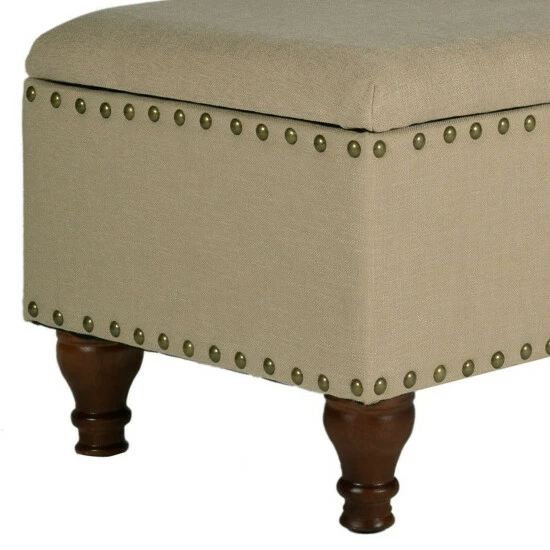Crafted using quality wood and plywood, and paired with a sultry, earthy beige polyester fabric upholstery, this large-sized bench will add style and storage to any room. A timeless look with nailhead trim, its hinged seat storage and turned wooden legs boast a sumptuous brown finish. Use as a dining bench when extra seating is needed or as an entryway bench to store accessories.