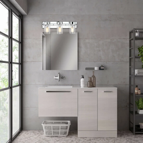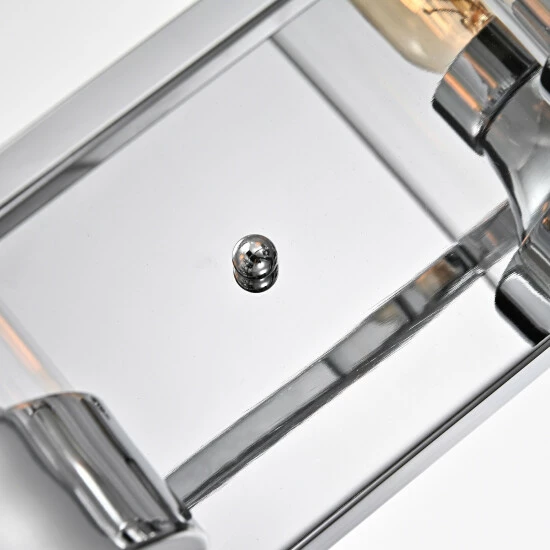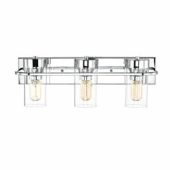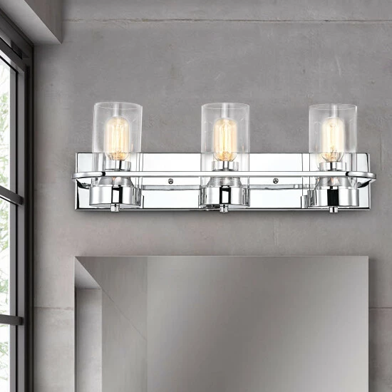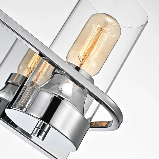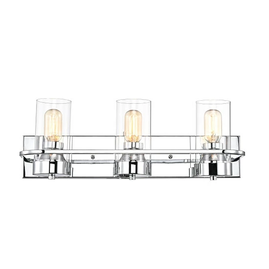 Blast away the dull darkness of any bathroom area, with this bathroom vanity lighting fixture, sure to stylize and illuminate your gorgeous visage while prepping for your day. With a sleek, gleaming chrome finish complementing clear, cylindrical glass shades, this piece also flaunts a coordinating rectangular wall-mounted back plate.