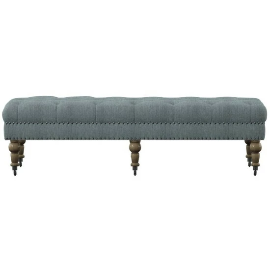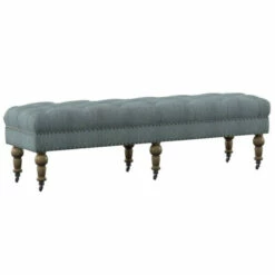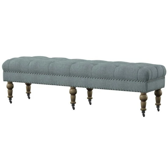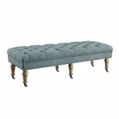 Relax in style with the elegant 62-inch bench in light blue. The graceful and refined bench features a beautiful light blue upholstery covering the seat, and button tufting across the top. Six spindle legs, sitting atop castor wheels, are finished in a distressed grey finish. Place the 62-inch bench at the foot of your bed, in your entry way, or your living room as a stylish accent piece, or as comfortable seating for your family and friends.