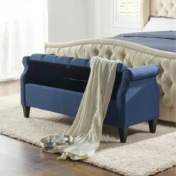 The Jacqueline Collection by Jennifer Taylor Home blends form with function in an elegant line of modern storage benches. Featuring luxuriant upholstered fabric accented with stylish rolled arms and dark espresso hardwood legs, this series provides both comfortable seating with hand-tufted cushioning and convenient organization with a spacious storage chest. Perfect for living rooms, bedrooms, or anywhere you need extra space, the Jacqueline Collection tidies your home in the finest fashion. C0 water and stain repellant upholstery with 30,000 double-rub count guards against soiling so most spills bead and roll off – pet- and family-friendly.