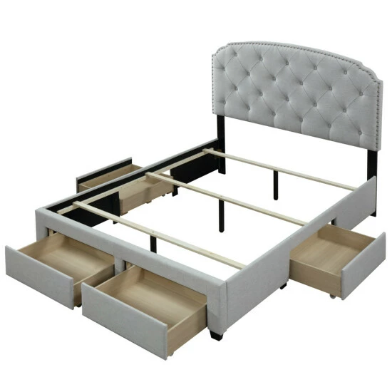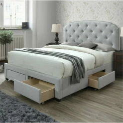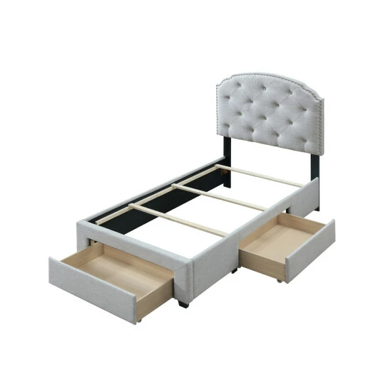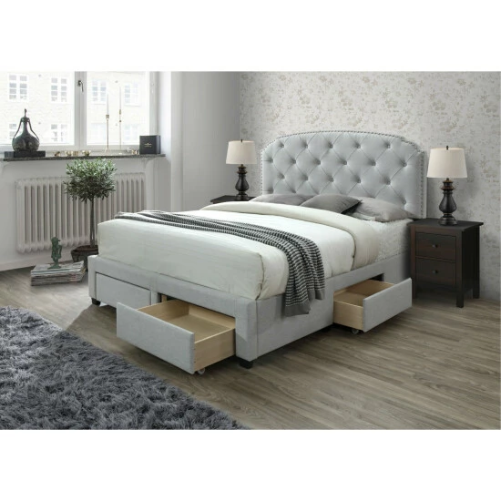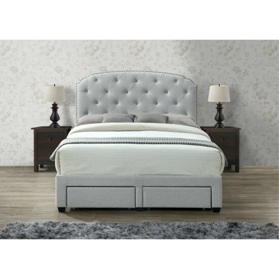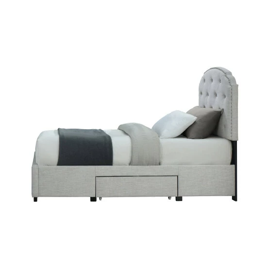 Sleep in style with the Pogradec panel bed from Copper Grove. The wood frame features an arched headboard that is detailed with button tufting and nailhead trim, while built-in drawers offer easy storage. Choose from four sizes and four upholstery colors to complement your decor.
