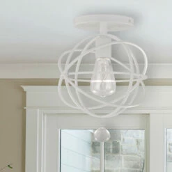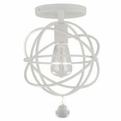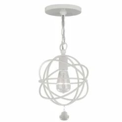 This collection 1-light pendant features a wet white finish that will complement many industrial and transitional decors. The atom shaped frame gives the light a unique look while adding interest to any space. The collection features cleaner lines and sleeker finishes and uses just one oversized glass jewel as an accent. Homeowners of every generation are gravitating to the richness and elegance of the . This piece includes 72 inches of chain and 120 inches of wire so it can be hung at your desired height (up to 82.5 inches). Dimensions: 10.5 inches high x 9 inch diameter.