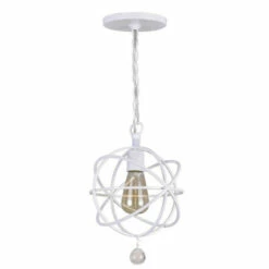This collection 1-light pendant features a wet white finish that will complement many industrial and transitional decors. The atom shaped frame gives the light a unique look while adding interest to any space. The collection features cleaner lines and sleeker finishes and uses just one oversized glass jewel as an accent. Homeowners of every generation are gravitating to the richness and elegance of the . This piece includes 72 inches of chain and 120 inches of wire so it can be hung at your desired height (up to 82.5 inches). Dimensions: 10.5 inches high x 9 inch diameter.