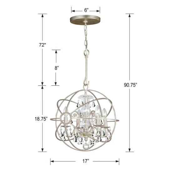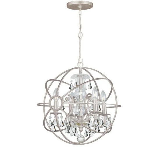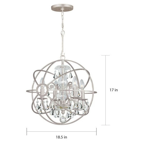 This collection 4-light mini chandelier features an olde silver finish that will complement many industrial and transitional decors. The atom shaped frame adds interest while hand cut crystal accents will add a touch of elegance to any space. Crystal chandeliers are glamorous and old Hollywood. We have expanded our best selling collection to add crystal elements inside the perfect sphere. We have married the contemporary sphere with the cut crystal chandelier, making the most beautiful jewelry for the room. This piece includes 72 inches of chain and 120 inches of wire so it can be hung at your desired height (up to 90.75 inches). Dimensions: 18.75 inches high x 17 inch diameter.