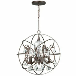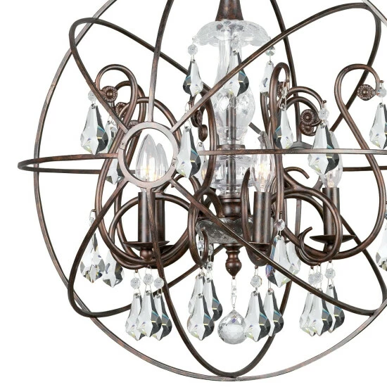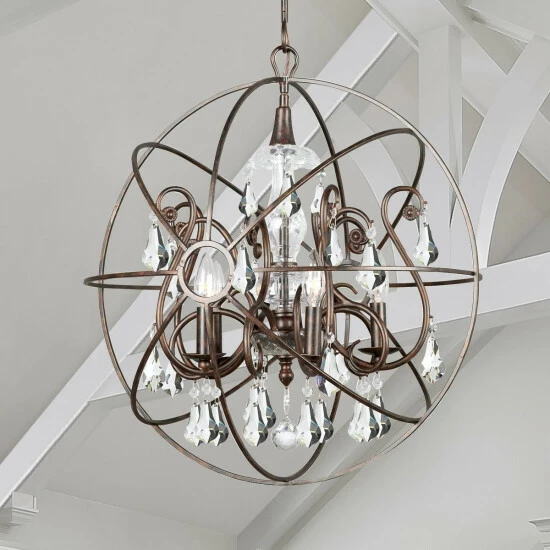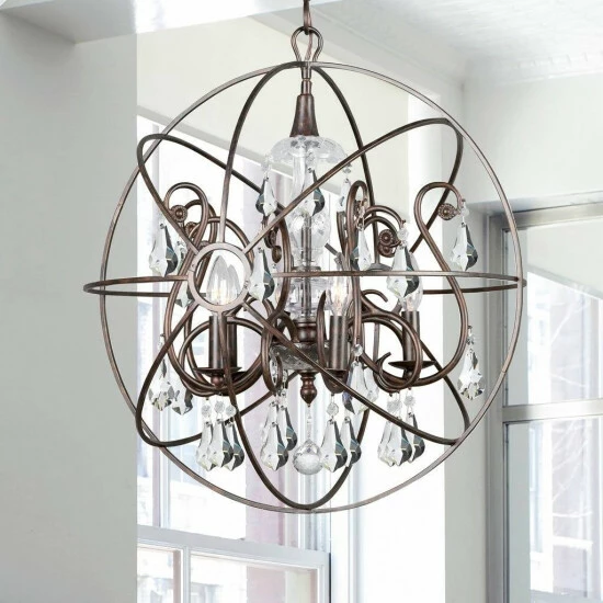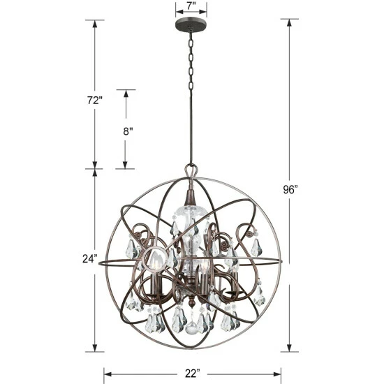 This 5-light chandelier features an English bronze finish that will complement many industrial and transitional decors. The atom shaped frame adds interest while hand cut crystal accents will add a touch of elegance to any space.This piece includes 72 inches of chain and 120 inches of wire so it can be hung at your desired height (up to 96 inches). Dimensions: 24 inches high x 22 inch diameter.