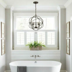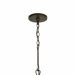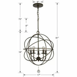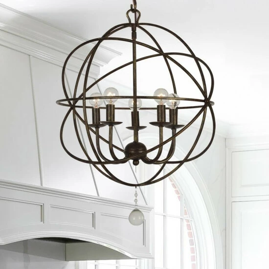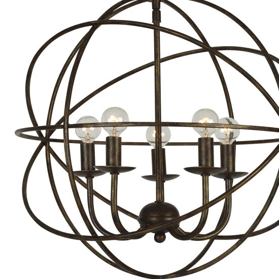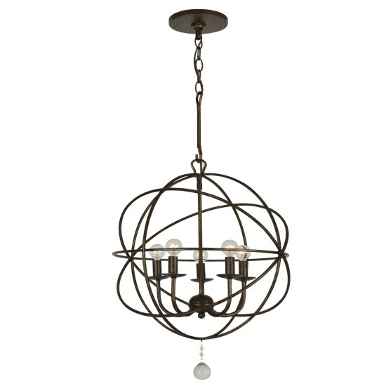This 5-light mini chandelier features an English bronze finish that will complement many industrial and transitional decors. The atom shaped steel frame adds interest and completes the look of this unique design. This piece includes one (1) 8 inch rod, 72 inches of chain and 156 inches of wire so it can be hung at your desired height (Up to 99 inches). Fixture Dimensions: 19 inches high x 17 inch diameter.