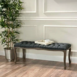 This charming farmhouse-style bench will add elegance, class, and vintage charm to your living space. With four elegantly curved wood legs, this bench is perfect for your bedroom, living room, or entryway. The upholstered, tufted, French-inspired design, complete with button-tufted style is the perfect combination.