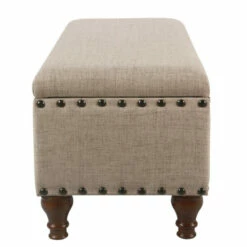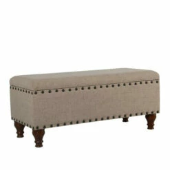 Add style and storage to any room in your home with our classic long storage bench. Featuring timeless nailhead trim and warm walnut finished wood legs, our multifunctional storage bench can provide seating and double as a coffee table, serve as a bedroom bench or as an entryway bench with storage. The luxuriously soft linen-like tan fabric easily blends with many different styles and colors. If youβre looking for a premium addition to your home at a reasonable price, make this your next accent furniture investment. Easy to assemble and maintain. Also available in classic neutrals, grays and blues.