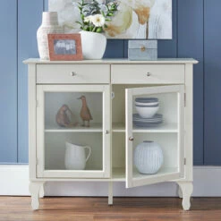 Give your home a pop of color and convenient storage with this charming buffet. A pair of glass doors open to reveal an adjustable shelf, providing plenty of room for flatware and collectibles, while two drawers are ideal for silverware, linens, or other items. The finish is available in a variety of trendy colors, and the simple, classic design complements any decor with traditional charm.