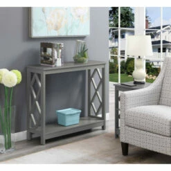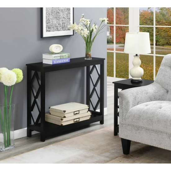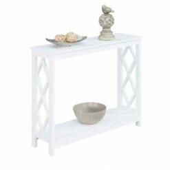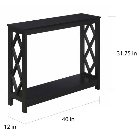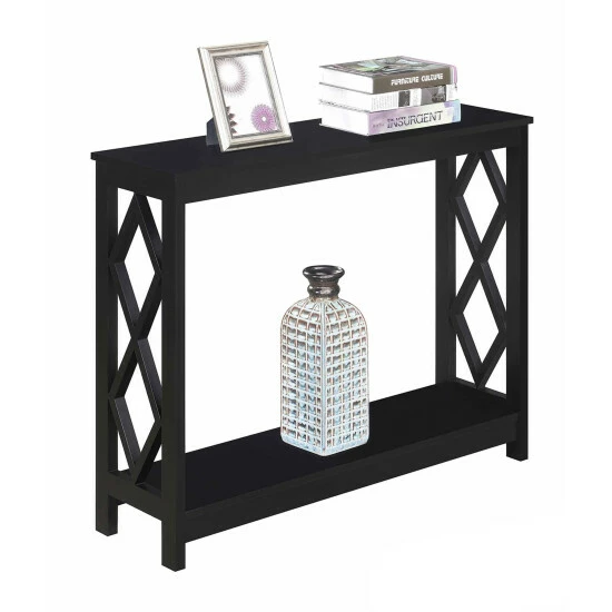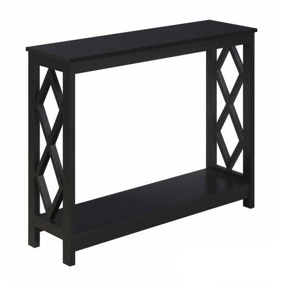 Transform your living room with this Copper Grove Rhombus Console Table w/ Shelves from Copper Grove. This table is available in white, black or grey. The design combines a clean-line silhouette with stunning diamond cut-outs that adorn each of the frames in a chic and contemporary way. Two ample shelves for all your favorite collectibles or entryway essentials. Crafted from particle board that is finished with a rich melamine veneer and non-lead based paint, the shelves are easy to clean.Β