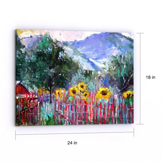 Foothills’ by Richard Wallich features a charming landscape scene with a bright red barn, vivid yellow flowers, and a gorgeous mountainous background. Printed using giclee techniques, this art piece offers a vibrant array of color while the gallery wrapped edges allow for quick, frame-free hanging.