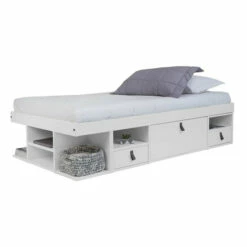 You’ll love to tuck away essentials and then tuck yourself in to sleep on this positively charming platform bed. This bed features an abundance of drawers, cubbies, shelves, and more, perfect for storing linens, bedding, and clothes. This platform bed is perfect for dorm rooms and other smaller spaces.