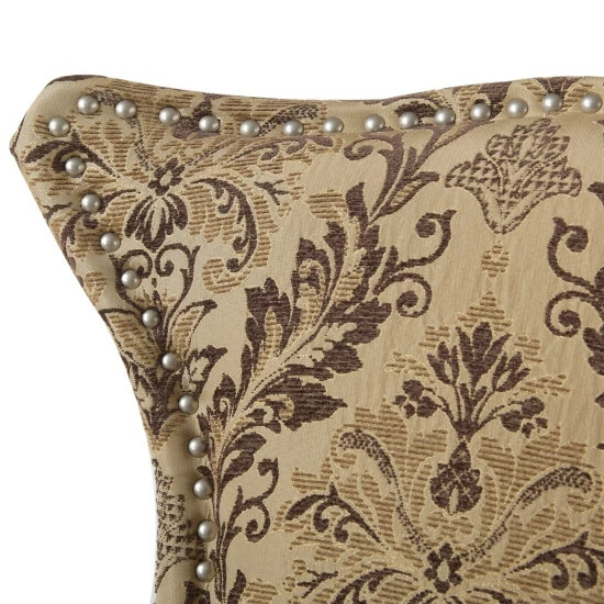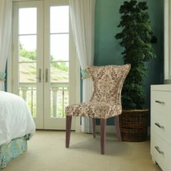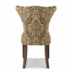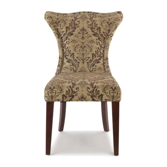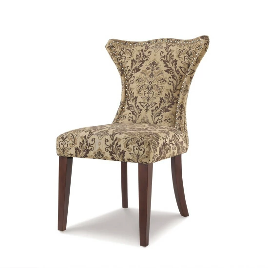 The elegant design of this gorgeous armless dining chair will complement your traditional dining room beautifully with its curved back and brown wooden legs. This classic dining chair features a paradise flower print and accented by a silver nailhead trim.