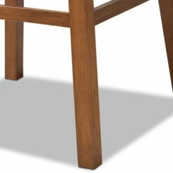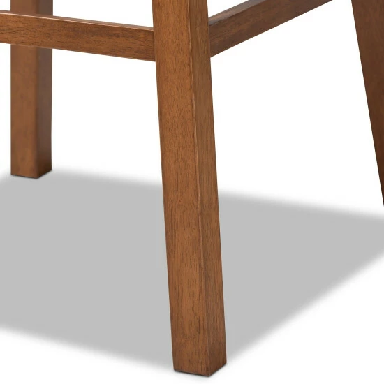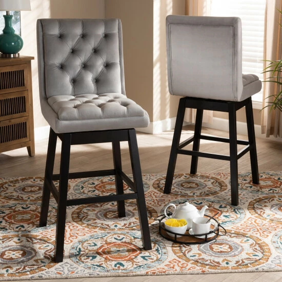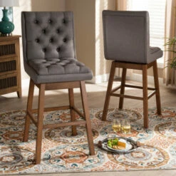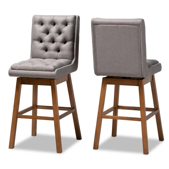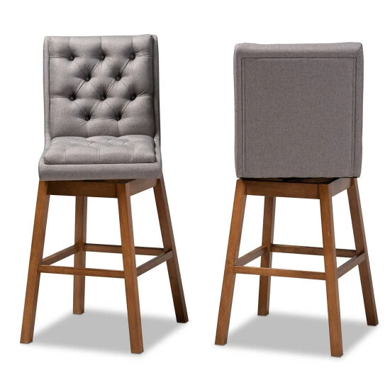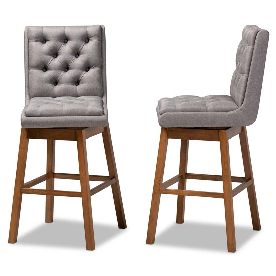 Kick back and relax with the bar stool. The is padded with foam cushions underneath grey polyester fabric and enhanced with elegant button tufting, making this piece a perfect addition to relaxed settings like a home bar or dining room. the stool is supported by an elongated walnut brown finished wood base fitted with foot rests.