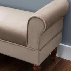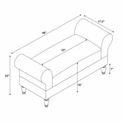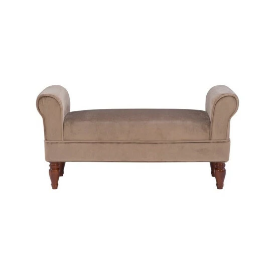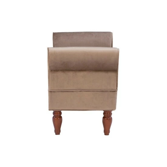 Adding a touch of elegance to your home with convenient seating, using this old style coffee finished bench. Upholstered in a rich microfiber, the bench has dark mahogany finished feet. Rolled sides add sophistication to the straight lined frame. A plush seat provides long lasting comfort. Ideal for providing seating in a bedroom, living room, hall or entry, this bench has classic style.