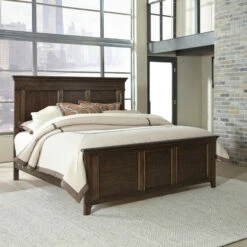 This traditional Saddlebrook panel bed is the perfect way to enhance your room with a transitional style that strikes a pleasant balance between tradition and today’s casual trends. This piece is crafted with rubberwood solids and birch veneers, featuring hook on rails, and a center support slat system, tied together by square peg accents. The deep tobacco finish is sure to add dimension and compliment any space effortlessly.