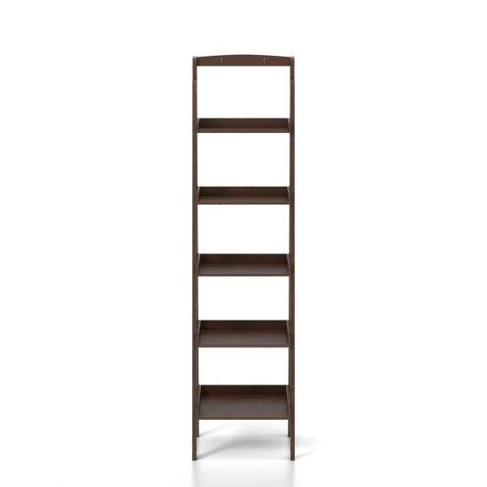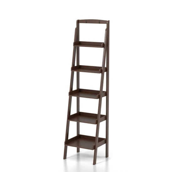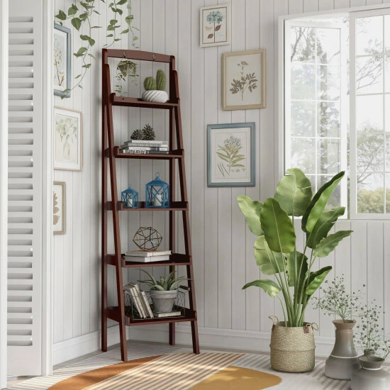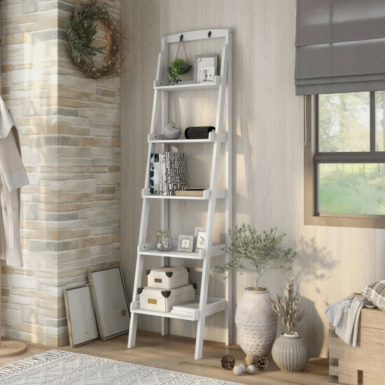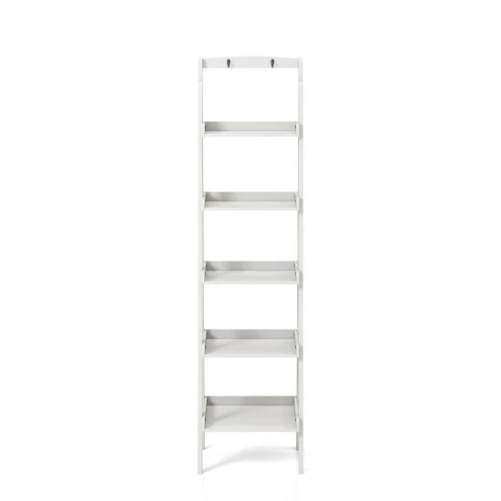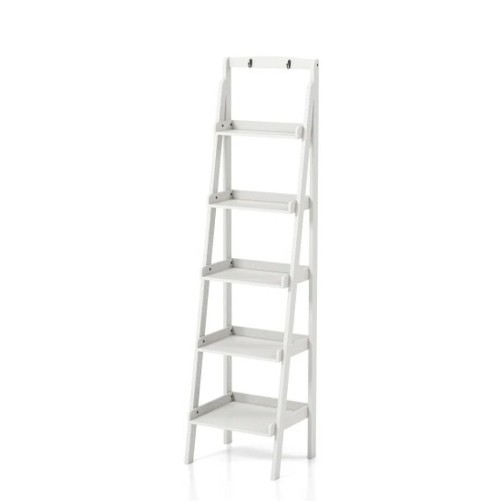With the Ladder Bookshelf, you can display those precious possessions you love, a favorite collection or simply increase your storage space. Five open shelves provide space you need for storage while maximizing the space you have with its slim ladder design. Two mounted hooks give you a unique option for displaying pictures or other items and the shelf has a slightly raised edge to keep items from rolling off.