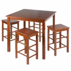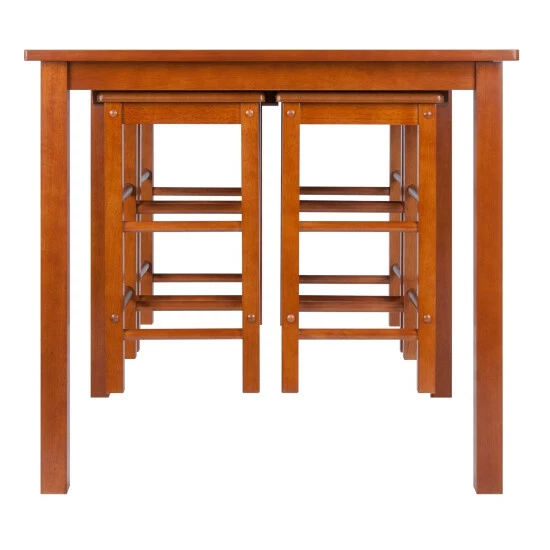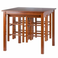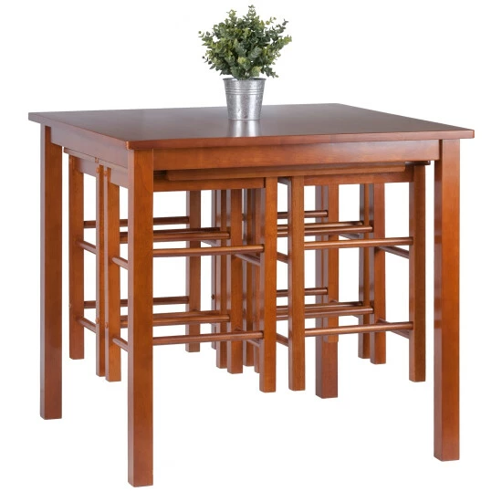 The 5-Pc Space Saver Set is designed to maximize small space living while offering big benefits. At 33″ square, this sturdy and compact Solid Wood table and stools set is perfect for kitchens and smaller dining areas. It also makes an ideal place for games, puzzles, and crafts in the kids’ rooms, den, or family room. When not in use, all 4 stools can be stowed away on the slip-in rails under the tabletop, keeping the room uncluttered and providing easy access for cleaning and pick up. Pull out one or more stools as you need. Both table and stools are made of Solid Wood for durability, and the natural wood grain, finished in Teak, adds warmth and polish to any setting.Overall Table dimensions: 33″W x 33″D x 30.1″H Clearance from floor to table apron: 27.4″H Distance between legs: 27.4″Stool dimensions: 14.1″W x 11.4″D x 20.8″H Stool seat thickness is .71″ (18 millimeters) Stool footprint at floor: 13.2″W x 10.4″DAssembly requiredShips in 1 box