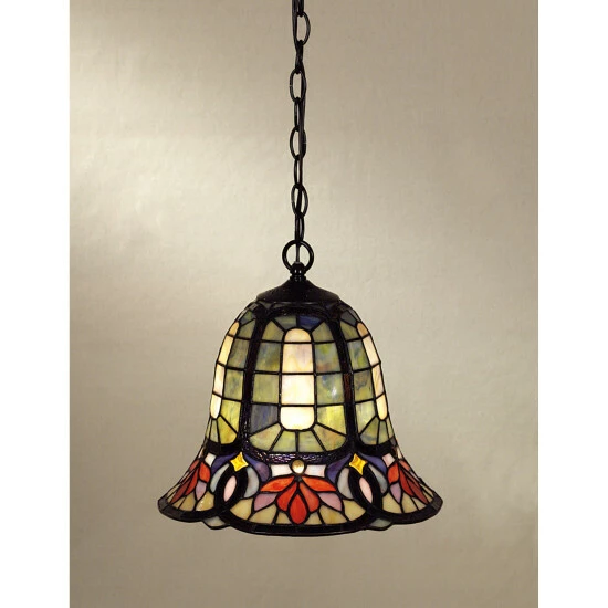 An absolutely breathtaking art glass design that is sure to impress. Features genuine handcrafted art glass in soft greens and creams accented with crimson and blue and arranged in a classic Art Nouveau pattern. Diamond shaped Quoizel Prismstones add even more dimension and texture to the design.